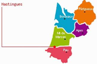 puerta oeste de entrada a la bastida Se localiza en la orilla izquierda del río Adour, en las Landas. La nueva ciudad (“bastida”) de Hastingues fue fundada de nueva planta por los ingleses que dominan el ducado de Aquitania en el año 1289, en el marco de una política de creación de nuevos asentamientos poblacionales en las zonas fronterizas con los territorios de Ultrapuertos que rendían vasallaje al rey de Navarra. Los planos de la ciudad seguían una geometría rigurosa y constituía una ciudad-refugio. Hasta mitad del siglo XV se construyeron numerosas nuevas “bastidas” durante la guerra de los Cien Años por ambas partes del conflicto. La fortaleza fue construida en 1304 por John Hastings, Senescal y Lugarteniente del rey Edward I de Inglaterra. Fue destruida el año 1377 por los de Bayona. Y se dice que se llevaron las piedras de la muralla para mejorar las de Bayona. El castillo fue destruido por Philibert de Chalons, Príncipe de Orange, al mando de las tropas del emperador Carlos V en el año 1523. Se conserva únicamente una torre como testimonio de la antigua edificación El rey de Navarra (y más tarde en 1314, rey de Francia) Luis I “le Hutin” construye en los primeros años del siglo XIV la Bastide Clairence para contrarrestar la implantación fronteriza de Hastingues.