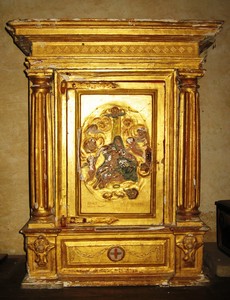 El antiguo retablo mayor de tablas pintadas fue colocado en el retablo de la Virgen del Rosario de la iglesia San Juan Bautista de Burlada (merindad de Sangüesa).