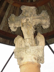 La cruz sigue modelos del segundo tercio del siglo XVI y se alza sobre cuatro escaños circulares, donde apoya una columna de fuste liso y capitel decorado por cintas y querubines que da paso a la cruz. Ésta presenta los remates florenzados, con un Crucificado expresivista en el anverso. En el reverso, la Virgen con el Niño.
