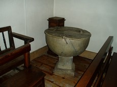 En el sotocoro se encuentra la pila bautismal de época medieval.