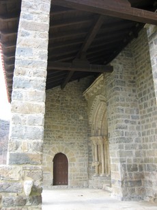 En el exterior, un pórtico medieval con un gran arco apuntado central con guardalluvia y dobles arquerías en los laterales. En el interior de este pórtico se desarrollan tres tramos de bóvedas de crucería que pudieran corresponder a los siglos XIV ó XV por los avances constructivos que incorpora. Este pórtico es semejante al de la iglesia de Larumbe.