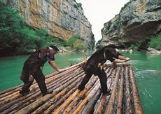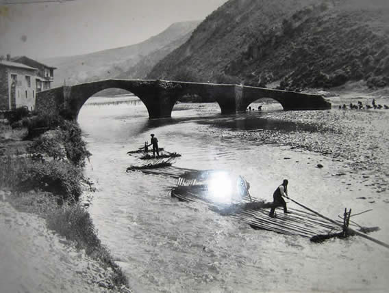 * cerca del puente se ha colocado una almadía como homenaje o monumento a los almadieros que con bravura y esfuerzo sacaban la madera del monte para llevarla por río a los mercados de la madera.