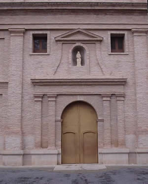 Al exterior, ladrillo a la vista, levantándose la fachada a los pies de la nave. Destacan las dos alas laterales del convento. La portada consiste en un arco de medio punto entre parejas de pilastras con capitel jónico con guirnaldas de laurel y ático con hornacina entre volutas y frontón triangular de remate. El segundo nivel de la fachada se decora con tres óculos, abierto el central y ciegos los laterales, con frontón triangular de remate. A los extremos de la fachada se adosan las torres.