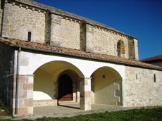 La portada medieval consiste en tres arquivoltas de arista viva que apoyan en columnas con capiteles decorados con bolas, palmetas y alguna cabecita. En un extremo se abre otra puerta con un simple arco apuntado. El pórtico del siglo XVIII presenta tres arcos de ladrillo sobre pilares de sillar que interiormente se cubre con bóveda de aristas. La torre fue construida en 1612-1620 y arreglada en 1918, aunque sigue la tipología y localización de las medievales, un cuerpo cúbico sobre el último tramo medieval de la nave.