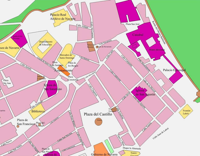 En líneas generales Pamplona conserva actualmente sin alteraciones de importancia el trazado de las calles de la época medieval, aunque sorprende la escasez de edificios monumentales de carácter civil que contiene actualmente el casco viejo de la ciudad, especialmente de época anterior al siglo XVIII, predominando los de gusto decimonónico.