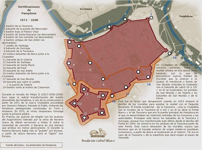Con la pérdida de la independencia política de Navarra en 1512 y la introducción por las armas de una nueva dinastía en el trono de Navarra, Pamplona se verá otorgar una función de plaza fuerte defensiva, carácter que no abandonará hasta finales del siglo XIX. Navarra que al menos desde Sancho III el Mayor en el siglo XI, y desde luego desde el advenimiento de la dinastía de Champagne en 1234, había sido "puente con Europa", desde 1512 se convertirá en "tapón con Europa", siendo desde entonces Pamplona un baluarte avanzado en la defensa de la frontera española y la religión católica contra la amenaza francesa y el naciente hugonotismo. En 1570 se dictan las primeras ordenanzas constructivas y se construye la Ciudadela en tiempos de Felipe II así como nuevos lienzos de muralla, cuyo trazado engloba el campo de la Taconera y otros lugares que ensanchan el terreno construíble intramuros.