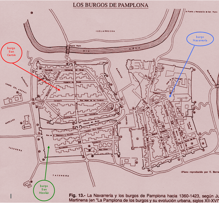 El auge que adquirió el Camino de Santiago favoreció el asentamiento de gente nueva, especialmente "francos" que se asentaban fuera del núcleo originario de la Navarrería y ejercían nuevas profesiones que enriquecían la ciudad y creaban una nueva burguesía. De esta manera la Pamplona medieval se caracterizará por la formación de otros núcleos urbanos - burgos - como los deSan Cernin o la Población de San Nicolás que reciben de los reyes sus respectivos "fueros", como el otorgado en 1129 al burgo de San Cernin por el rey de Aragón y de Navarra, Alfonso I el Batallador (1073-1104-1134). Todos estos burgos dependían jurídicamente del Obispo. También existieron otros barrios que no alcanzaron la importancia de los anteriores pero que formaron parte de la ciudad: el barrio de San Miguel (documentado ya en 1214), la Judería, al comienzo del reinado de Sancho VI el Sabio (1132-1150-1194), ambos localizados dentro de la Navarrería y la llamada "Pobla Nova del Mercat", situada en la zona de la Taconera y vinculada a la parroquia de San Lorenzo. En ciertos momentos, un cerco amurallado circundaba a cada uno de los burgos para protegerse de sus vecinos, lo que condicionó la futura estructura urbanística de la ciudad.