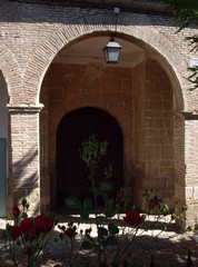 La portada consiste en un arco de medio punto protegida por un pórtico barroco de ladrillo, de tres arcos sobre pilares. La torre es del siglo XVII y se adosa a los pies de la iglesia.