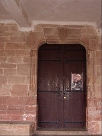 Se accede al templo por un simple arco rebajado que se abre a los pies del templo por el lado de la Epístola. Se protege bajo un pórtico adintelado que descansa en dos columnas, una de las cuales aprovecha un capitel románico, figurando cabezas, rudas de labra. Rodea este lado de la Epístola hasta el crucero una lonja con pirámides y bolas, características del siglo XVII. La torre es de estilo herreriano y se levanta a los pies sobre la propia nave. Consta de un cuerpo de campanas con medios puntos en sus frentes y remate de cúpula con pirámides y bolas.