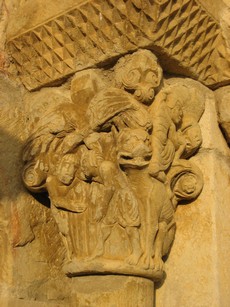Al exterior, una galería porticada de cuatro arcos de medio punto cobija la portada gótica, contemporánea del templo. Consiste ésta en un arco apuntado con cinco arquivoltas baquetonadas sobre imposta moldurada lisa a modo de capitel corrido y sus correspondientes columnas entre baquetones sobre un zócalo. Remata el conjunto un guardalluvias exterior que apoya en ménsulas. Sobre la puerta se alza un tímpano semicircular románico del siglo XII, probablemente procedente de la primitiva iglesia consagrada en 1146. En él se representa un crismón entre dos círculos con entrelazo y flores, rodeados todos ellos de una greca decorativa. Una hilera de canes lisos recorre todo el perímetro de la iglesia. La torre se alza a los pies, sobre el último tramo de la nave.