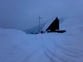 Construcción moderna de 1965 con puntiaguda techumbre de losetas de pizarra, dispuesta para las intensas nevadas, ventanales en el ábside y una cruz aledaña con campana en recuerdo de la primitiva que se trasladó a la iglesia de Santiago en Roncesvalles.