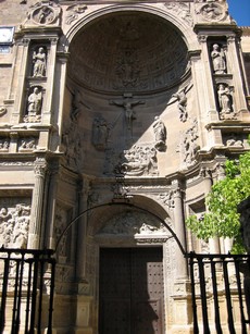 El cuerpo bajo de la fachada es de buena sillería y corresponde al siglo XV ya avanzado, mientras que corresponde al siglo XVI la realización en ladrillo. A la primera época corresponde la doble arcada con leve apuntameinto, de grandes dovelas, una de las cuales da paso al templo y la otra se ha cegado. Encima de cada uno de estos arcos se sitúan sendos escudos rectangulares con el anagrama de Cristo - IHS - en caracteres góticos.