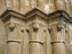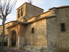 La portada románica consiste en un medio punto abocinado por tres arquivoltas baquetonadas que apoyan sobre columnas con capiteles decorados y bolas en los extremos. Lleva en el tímpano un crismón trinitario.