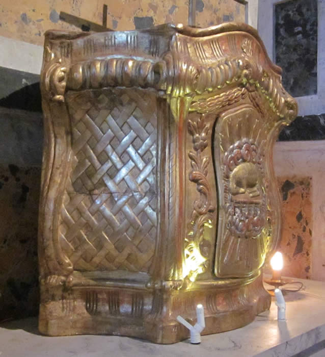 Le décor est fait de stucs peints en faux marbre, composé de socles, de colonnes et pilastres, de chapiteaux doriques et composites, de corniches et medaillons, qui entourent trois grands tableaux: Saint Jean Baptiste à gauche, l'Ascension de la Vierge à l'autel principal et Saint Nicholas à droite.