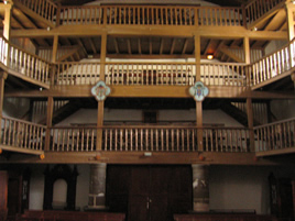 Eglise entourée de galeries au sol pavé de pierres tombales.