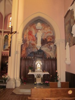 En 1874, construction de l' église sur les plans de l' architecte palois Gabriel Serres. Les verrières sont fournies en 1895 par le Palois P. Arcencam. Entre 1932 et 1934, le peintre palois René-Marie Castaing peint un cycle de la vie du Christ au-dessus des arcades de la nef, une théorie de saints dans les arcatures aveugles du choeur et diverses scènes sur les murs du transept; ce décor est complété en 1946 par le chemin de croix peint par son frère Joseph Castaing. Le tympan du portail d' entrée est orné vers 1930 d' une mosaïque par l' atelier Mauméjean Frères.