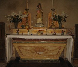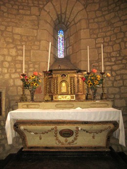 Chevet en moyen appareil de grès molassique d' un jaune ocre. Galets, tuiles en gros oeuvre et blocs de grès en façade. Fenêtres et portail en grès molassique. Clocher-mur au nord.
