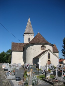 L' ancienne église appartenait aux chevaliers de l'Ordre de Malte et dépendait de la Commanderie de Caubin (Arthez de Béarn) et Morlaàs.Entre 1901 et 1906, elle est (entièrement ?) reconstruite sous le curé Victor Peyret-Cauhapé (qualifié de "fondateur de cette église" par son successeur sur une plaque commémorative apposée dans le porche en 1910). Il est possible toutefois que l' architecte, peut-être Bourdette, ait réutilisé les murs de l' ancienne nef pour le nouvel édifice. Les peintures décoratives des murs et de la voûte de la nef sont peut-être attribuables à l' atelier du peintre Louis Decrept de Bayonne, qui travailla à plusieurs reprises dans d' autres églises du canton. Les 8 verrières furent fournies vers 1930 par Henri Gesta, maître-verrier de Toulouse.