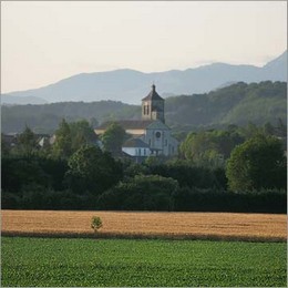 vue de l'église - façade ouest du mur-pignon - et les Pyrénées