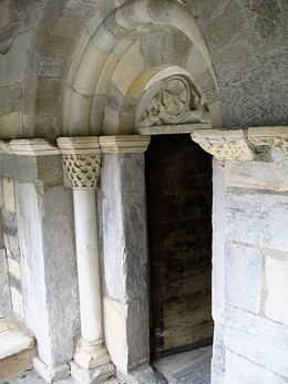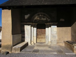 Sa porte ouverte au midi est flanquée de colonnes engagées elles sont surmontées de chapiteaux très primitifs ornés de cornes enlacées. L'abaque découpé de raie-de-coeur fait fonction d'imposte et reçoit la retombée de l'arc sous lequel se dessinent dans un tympan deux anges soutenant de leurs mains l'anagramme du Christ.