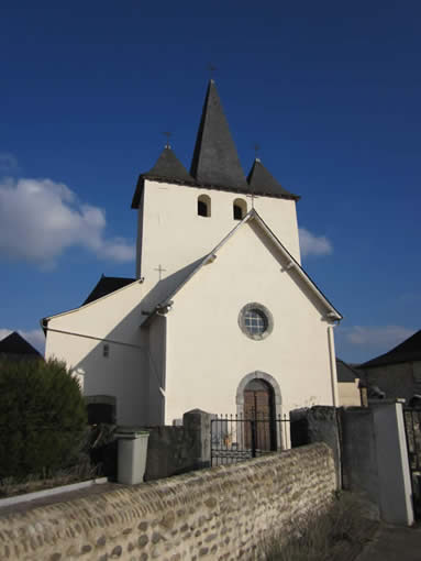 En 1855, construction du clocher par l' architecte oloronais Bernard Montaut. En 1883, projet de reconstruction du clocher, qui menace ruine, par l' architecte orthézien Bourdette. Travaux exécutés de 1883 à 1885 par l' entrepreneur Jean-Pierre Jouanillou, de Saint-Goin; achèvement définitif des travaux en août, consécration de l' église par Mgr Ducellier en décembre 1885.