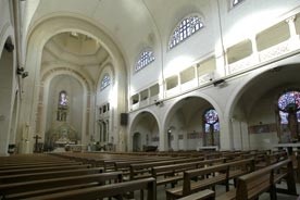 * nef de 3 travées avec arcades en plein cintre, triforium, fenêtres-hautes et voûte à pénétrations; choeur couvert d' une coupole octogonale surmontée d' un clocher