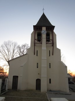 clocher-mur surmonté d'une flèche carrée en pavillon et flanc de la nef du côté de l'Epître