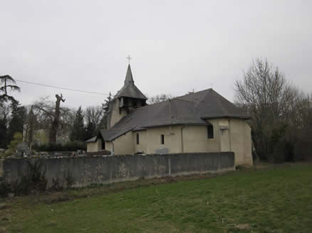flèche du clocher, abside semi-circulaire et flanc sud de la nef