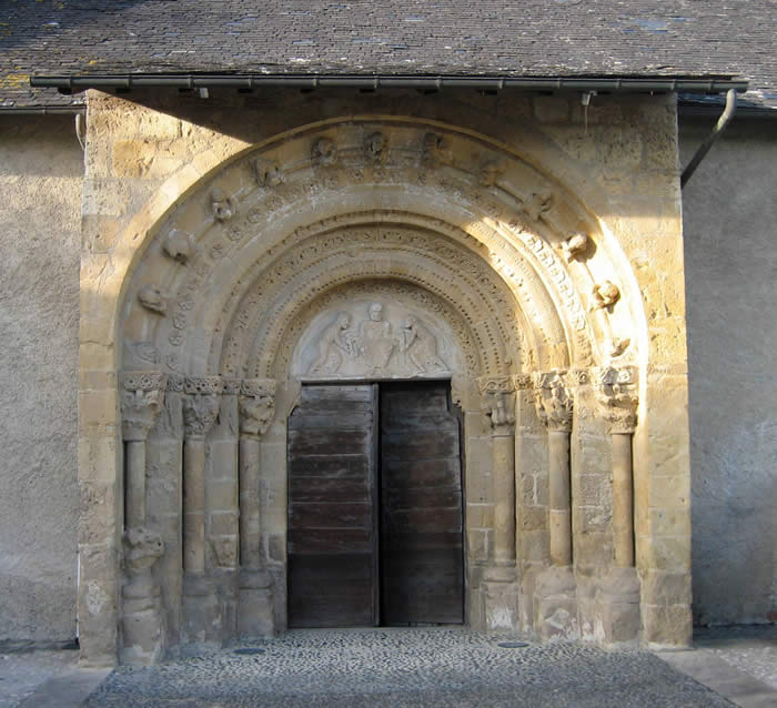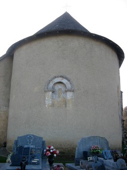 Edifice roman (fin XIème-début XIIème siècle) à nef principale et bas-côté sud, ponctué vers l' ouest par un grand clocher-mur. Le portail sud a été sculpté vers 1150 sous l' influence du maître de Morlaas.