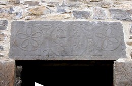 En entrant dans l' édifice, on observe au sud-ouest des fons baptismaux datés 1643 accompagnés de l' inscription latine: "DOCETE ONS BAPS M EOS I NOMINE PATRIS & FILII & SP SII SEPTENBER 17".
