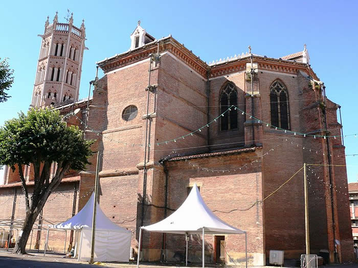 Le clocher de style gothique toulousain s'inspire fortement de celui des Jacobins de Toulouse : imposante et briquetée, la tour octogonale est éclairée à chaque étage de fenêtres géminées terminées par un arc en mitre. Elle remonte au XIVe siècle. On pourra remarquer les créneaux et les meurtrières, témoignant du passé houleux de la ville. Ce clocher a été couronné au XIXe siècle par une galerie identique à celle des Jacobins grâce à l'architecte De Coma, ce qui ne dépareille nullement cette tour qui pouvait paraître un peu massive.