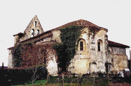 L’église Saint Jean Baptiste étant aujourd’hui dissimulée au nord par les bâtiments de l’ancien presbytère, il faut aller dans le cimetière qui l’entoure au sud et à l’ouest pour découvrir ses dispositions anciennes, mais aussi les traces d‘une histoire assez compliquée, en raison de sa position aux confins des parties sous dépendance anglaise et française de la Gascogne. En examinant le plan chronologique, on voit bien comment était à l’origine conçu l’édifice : un chevet composé d’une abside flanquée de deux absidioles dont une a disparu, une nef unique, et deux bras donnant accès aux absidioles.
