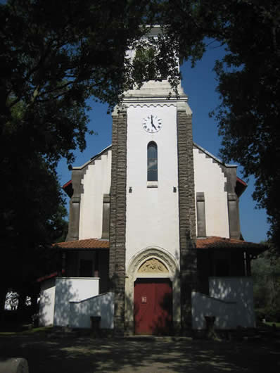 * clocher-porche, une chapelle baptismale au nord ; nef avec tribunes de bois à 2 niveaux régnant sur 3 côtés et délimitant de faux bas-côtés.