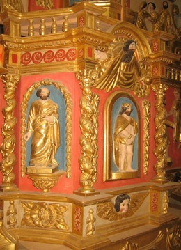 Les sculptures. Dans le choeur une statue de Saint Jean Baptiste du XVIIe siècle. On y trouve aussi une croix processionnelle en bois sculpté, doré et peint, datant du XVIIIe siècle.